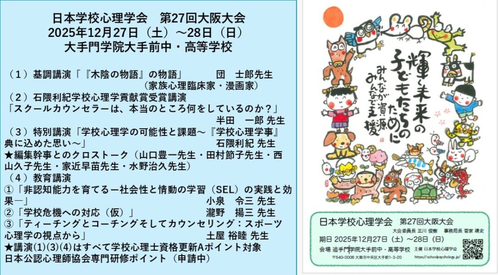 日本学校心理学会第27回大阪大会は、2025年12月27日(土)~28日(日)の2日間、大阪城の天守閣を望む追手門学院大手前中・高等学校を会場に開催いたします。