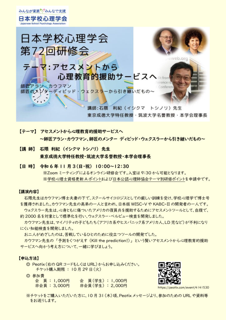 日本学校心理学会ホームページ(https://schoolpsychology.jp/workshop/index.html)よりご確認ください。
